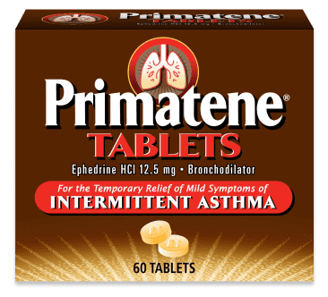 Formulated with ephedrine HCl, Primatene Tablets give you temporary, powerful relief of intermittent asthma symptoms for up to 4 hours—without a prescription. Designed to relax the muscle bands that may tighten around your airways, Primatene Tablets help rapidly open your airways to allow more airflow. Get back to breathing at your best with Primatene Tablets.